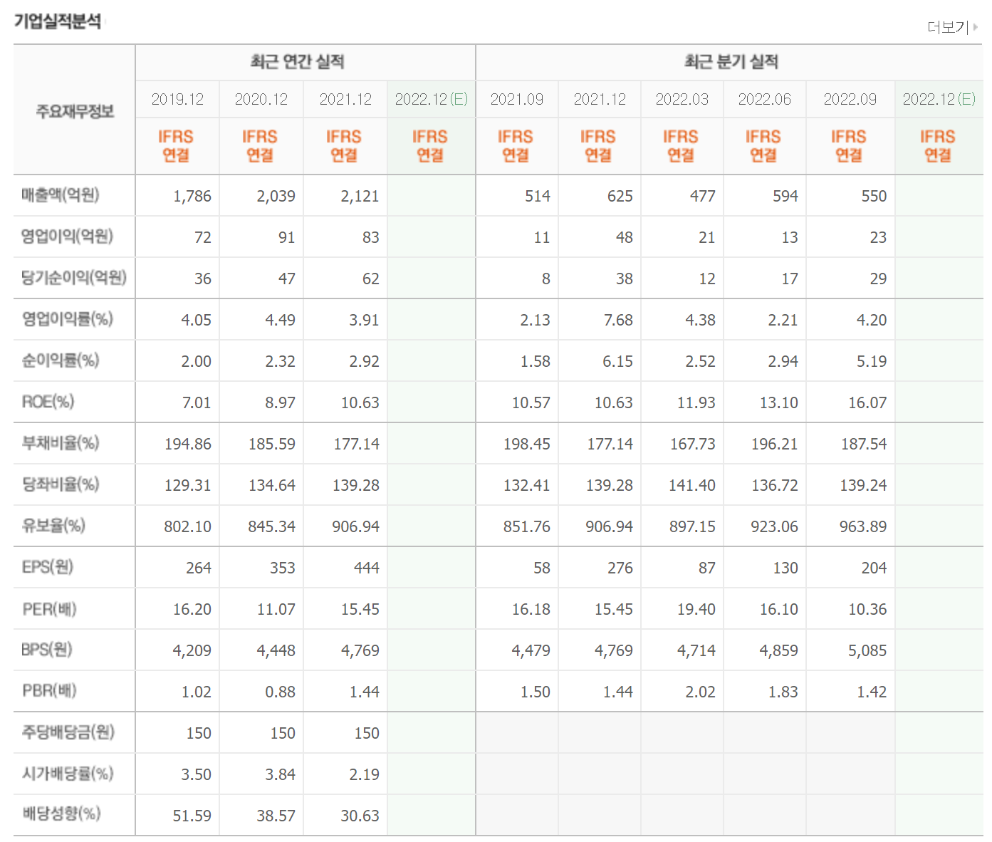 금호건설은 매년 1조 중후반대의 매출을 올리고 있으며 2021년부터 2조 매출을 달성하고 있습니다. 2022년에도 2조 매출이 예상되고 있으며 유보율과 부채비율은 준수한 편입니다.