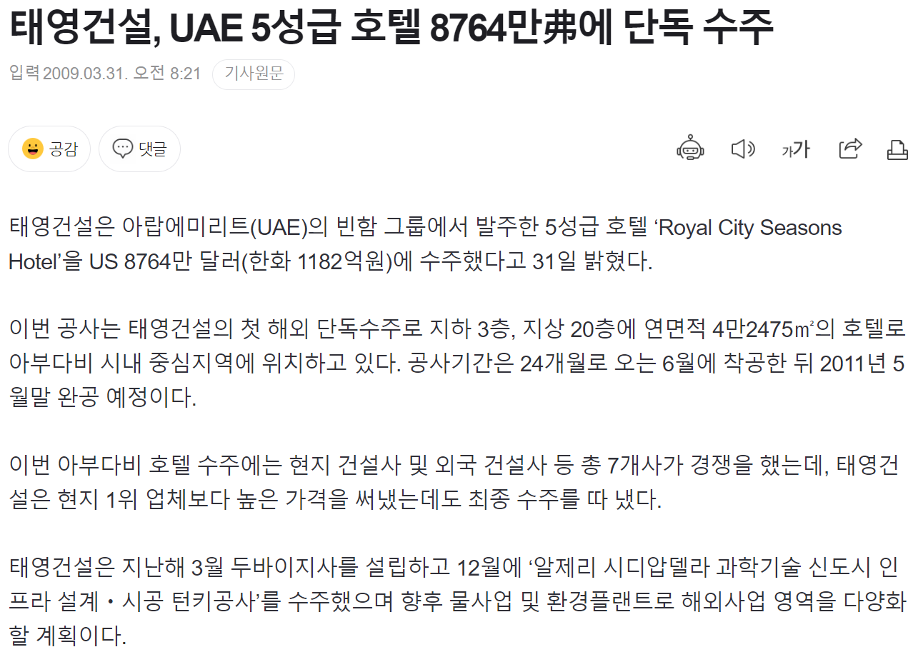 태영건설은 UAE에 5성급 호텔을 수주한 이력이 있으며 2008년 두바이 지사를 설립한 이력이 있어 수혜 기대감에 따라 관련주로 편입되어 있습니다.